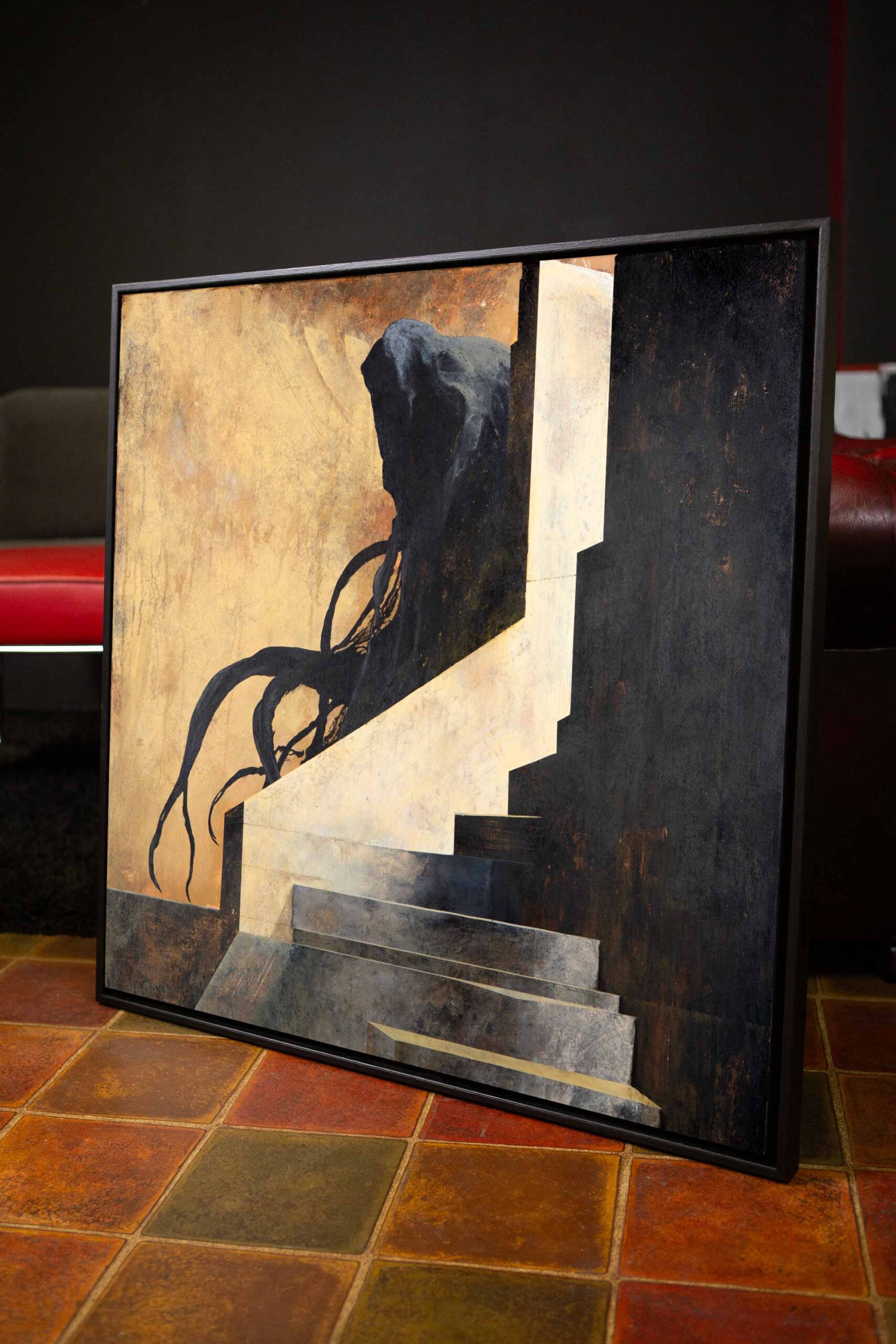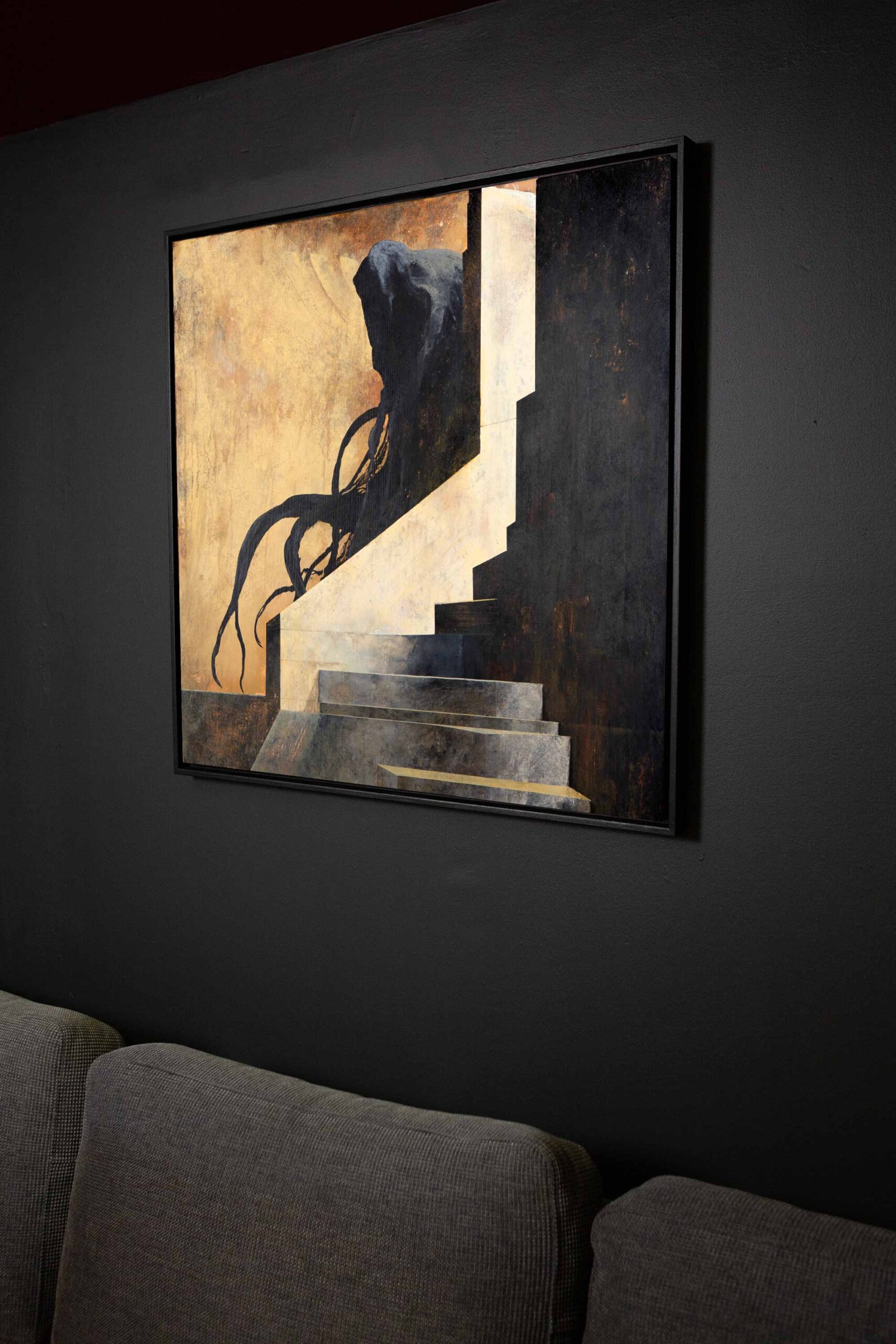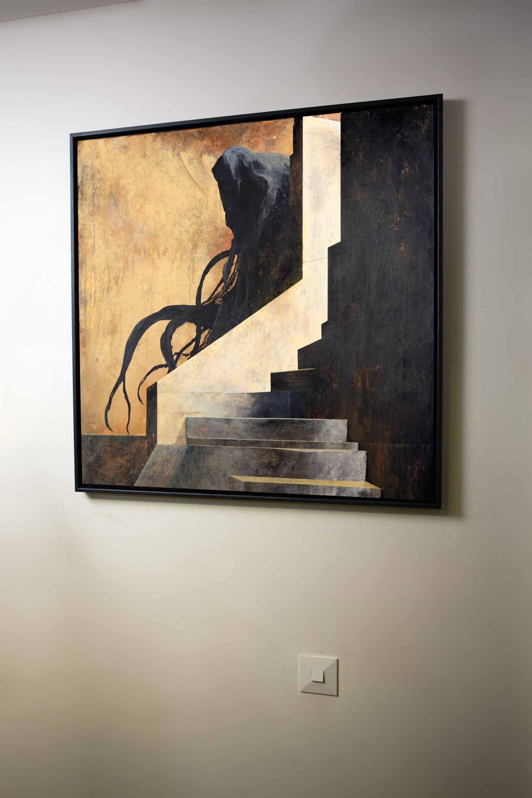 Custom built and painted wooden frame included. Total size of the art piece with the frame is 84 x 84 x 3,5 cm (33 x 33 x 1,4 in). If you would prefer a certain color or tone for the frame let me know!